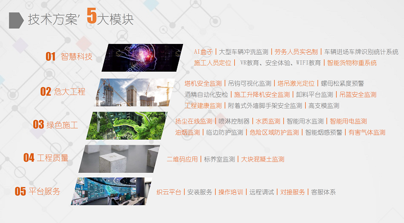 智慧工地有五大核心分區(qū):智慧科技、危大工程、綠色施工、工程質(zhì)量、平臺服務(wù)等。具體產(chǎn)品有